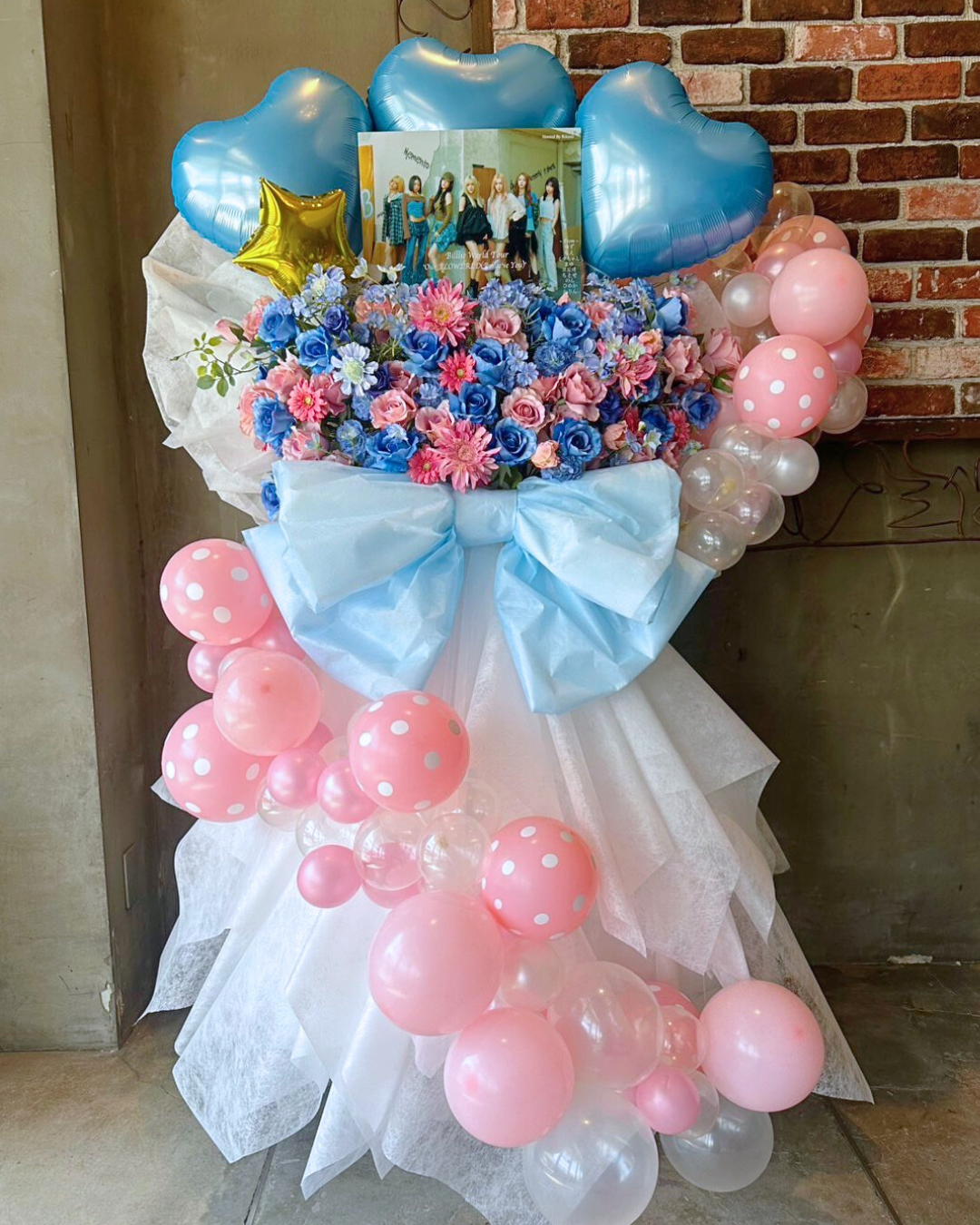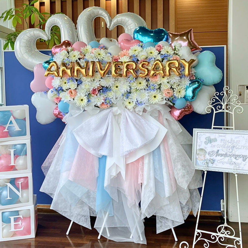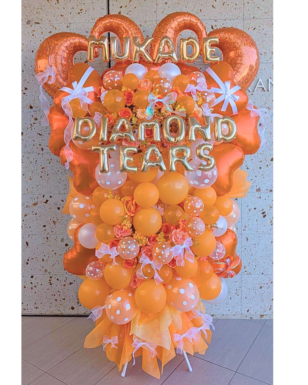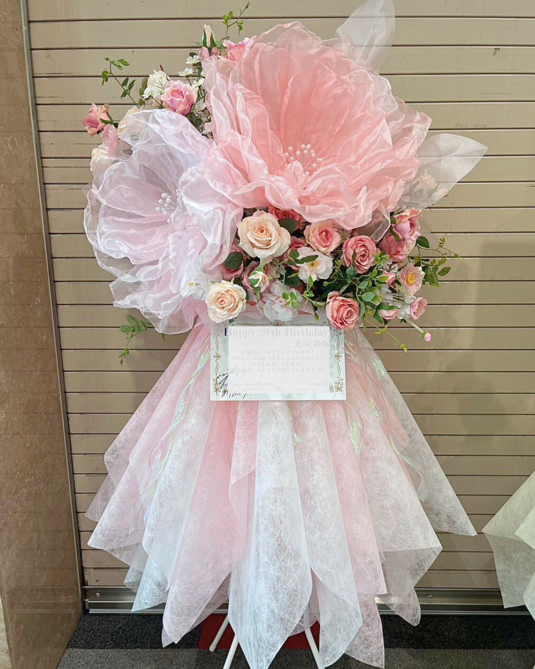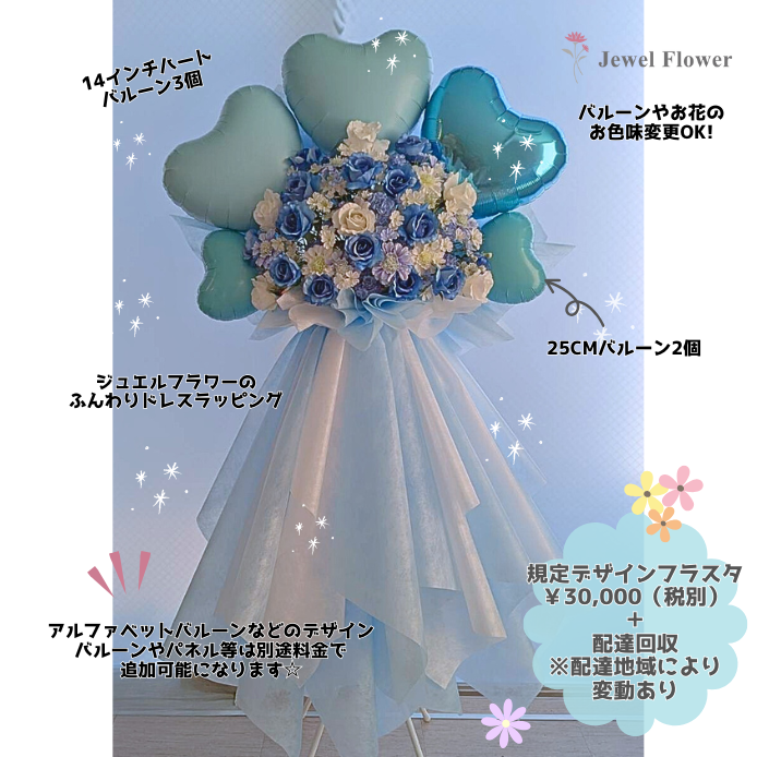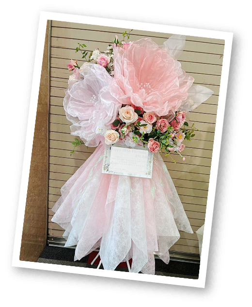 ジュエルフラワーのフラスタに使用するお花は全てアーティフィシャルフラワーを使用しております。アーティフィシャルフラワ ーとは、生花の一番キレイな頃合いを再現した上質な造花です。生花と見劣りしない美しさが特徴です。アーティフィシャルフラワーを使用していることで数日間の公演や、長期間の設置も可能となります。また、 装飾品もこだわっており、 自社特許を取得している大きなお花や海外から直輸入している資材など他店と被らない装飾品も特徴です☆